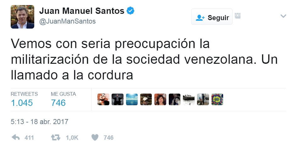 Sin embargo, el presidente Santos, publicó un trinar donde expresó: “Vemos con seria preocupación la militarización de la sociedad venezolana. Un llamado a la cordura”, a través de su cuenta oficial en Twitter @JuanManSantos, quien por lo visto confunde la palabra miliciano con militares, en ese caso podríamos destacarle y comentarle en modo didáctico que la palabra “miliciano” se debe a los civiles que actúan en defensa de la nación,mientras que la expresión “militar” corresponde a los individuos, instituciones, instalaciones, equipamientos, vehículos y todo aquello que forme parte de forma directa e inseparable de las Fuerzas Armadas o Ejército. Lo peor es que ambas definiciones o términos el presidente Santos, como primer mandatario de una nación, debería tenerlas muy claras para así poder diferenciarlas y así no quedar en ridículo.
