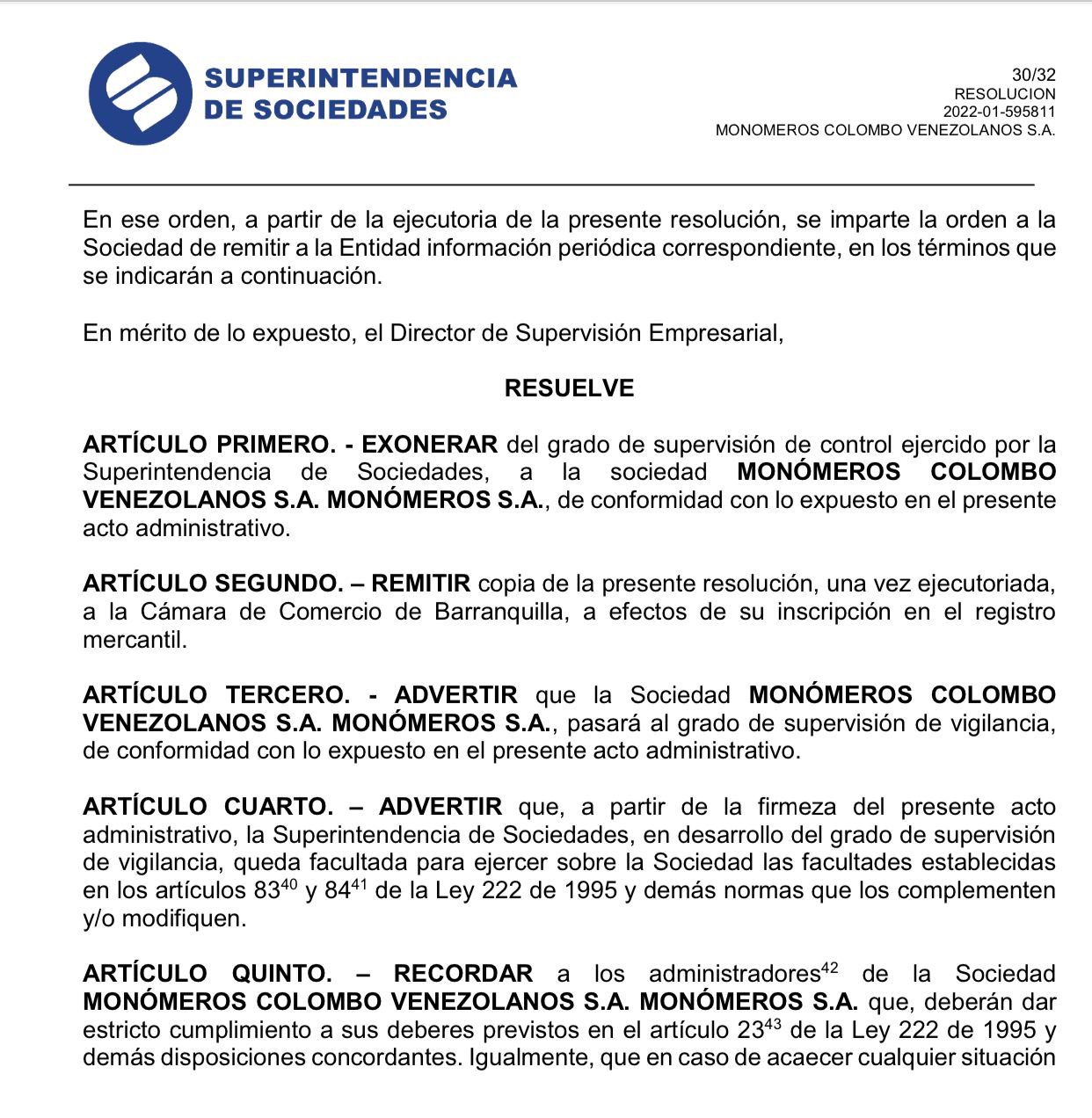 En ese sentido, el artículo primero establece que se exonera a Monómeros del grado de supervisión de control ejercido por la Superintendencia de Sociedades. Luego, en el segundo artículo, se advierte que la empresa binacional pasará a grado de supervisión de vigilancia. Se recuerda también a los administradores que deberán dar cumplimiento a sus deberes previstos en la artículo 23 de la Ley 222 de 1995 y demás disposiciones concordantes.