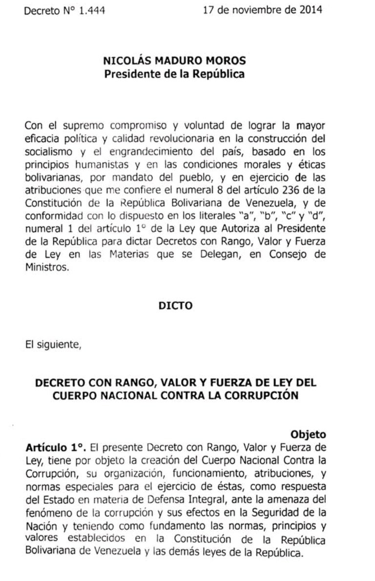 La Policía Nacional Contra la Corrupción fue creada en 2014 por Decreto N⁰ 1.444 con rango, valor y fuerza de ley, y aprobada por la ANC como parte del conjunto de leyes habilitantes, con el fin de responder contundentemente a la corrupción como una estrategia integral en la defensa del Estado.
