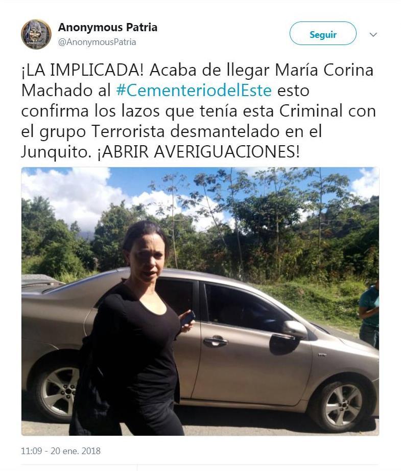 Es por ello, que en la cuenta twitter @AnonimousPatria pilló y colgo el momento en que la amargada de María Corina Machado llegaba al Cementerio del Este para hacer su circo mediático. » ¡LA IMPLICADA! Acaba de llegar María Corina Machado al #CementeriodelEste esto confirma los lazos que tenía esta Criminal con el grupo Terrorista desmantelado en el Junquito. ¡ABRIR AVERIGUACIONES!»