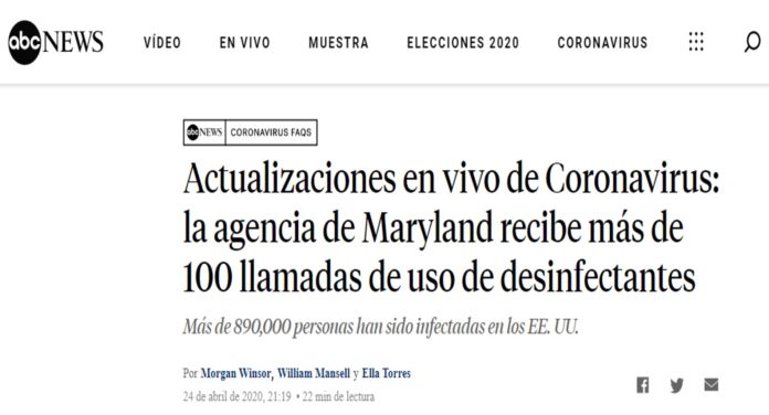 Más de 100 personas llamaron a los números de emergencia en el estado de Maryland para consultar si podían beber desinfectante tras el anuncio de Trump donde afirmaba que eso eliminaría de inmediato el coronavius.