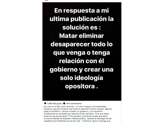Por lo que Lander hizo públicas las fuertes intimidaciones hechas por usuarios de la conocida red social y replicó con el siguiente texto: “No creo ni apoyo a los extremistas. ¿O es que todos tenemos que pensar igual? No es esa por unas de las causas que tanto luchamos libertad de expresión (…)”, al tiempo que invitó a aquellos que no comparten su opinión a dejarlo de seguir en las redes sociales.