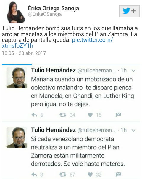 Todos sabemos que luego de las guarimbas terroristas convocadas por la oposición venezolana, Tulio Hernández, columnista del diario de ultra derecha El Nacional hizo llamados violentos incitando al odio y a la muerte a través de su cuenta personal en twitter @tulioehernandez y es que en la mencionada cuenta el fascista colgó un mensaje que decía: “Si cada venezolano demócrata neutraliza a un miembro del Plan Zamora están militarmente derrotados. Se vale hasta materos”.